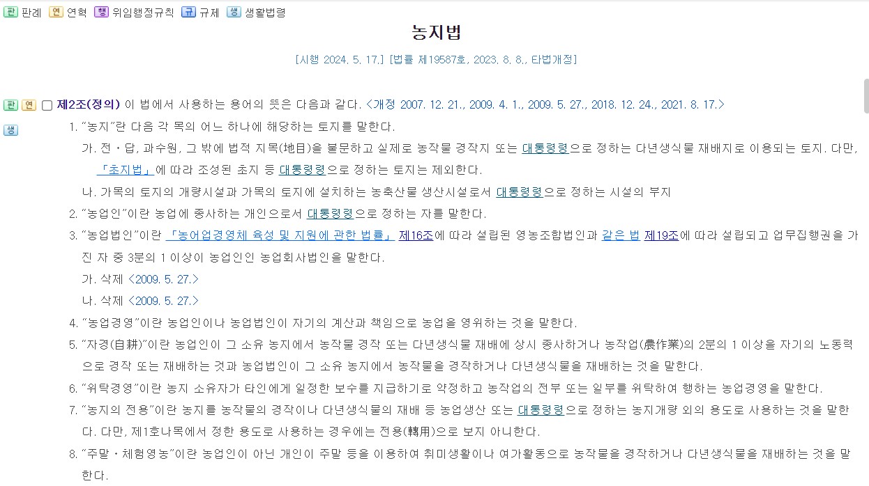 농지법에 따르면, 농지란 전 또는 답, 과수원, 그 밖에 법적 지목을 물문하고 실제로 농작물 경작지 또는 다음 중 어느 하나에 해당하는 다년생식물 재배지로 이용되는 토지를 말합니다.