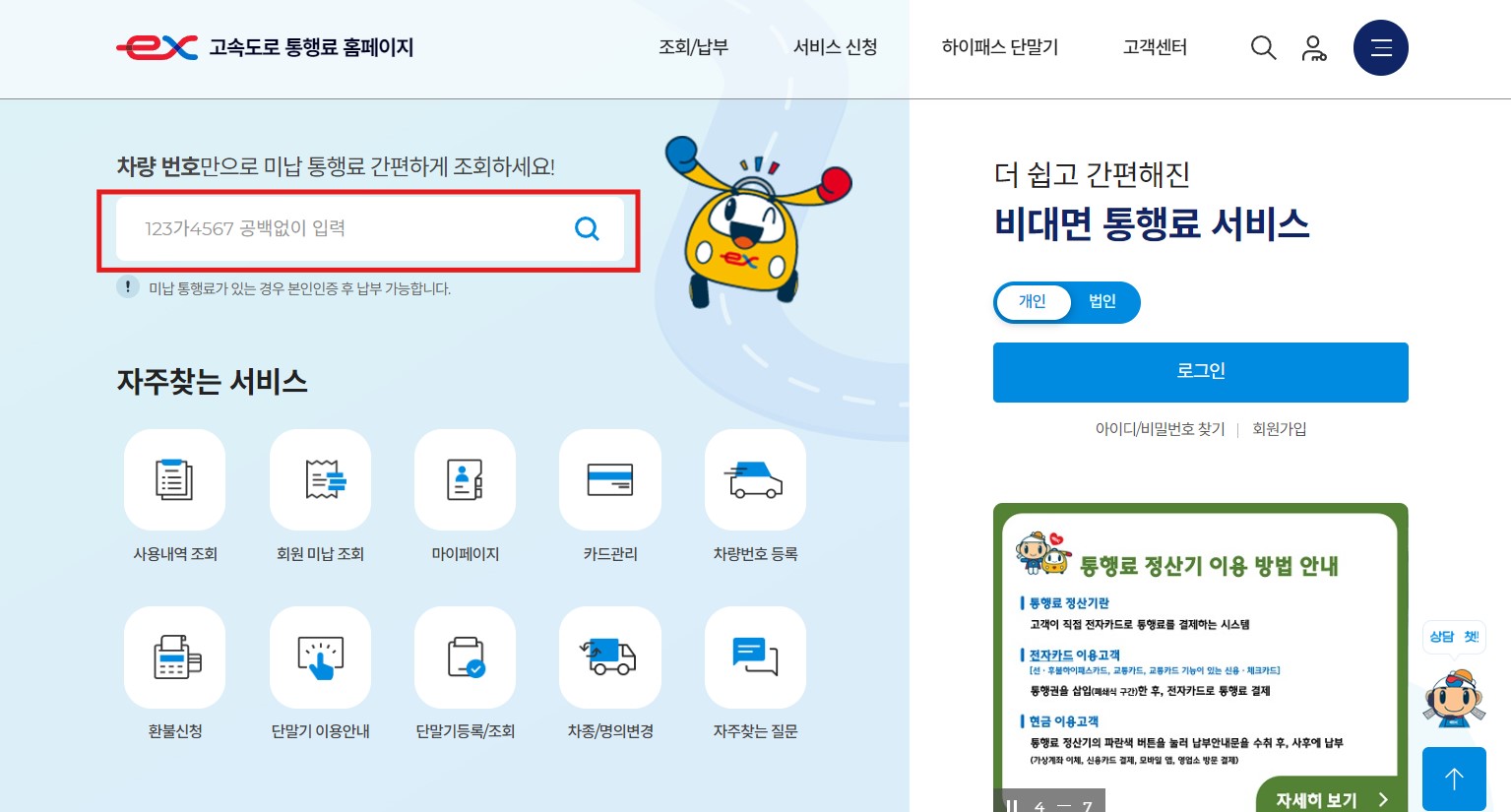 | 비(非)방문 | 고속도로 통행료 홈페이지 | 본인명의 로그인 | 계좌이체 / 후불 / 신용카드 |